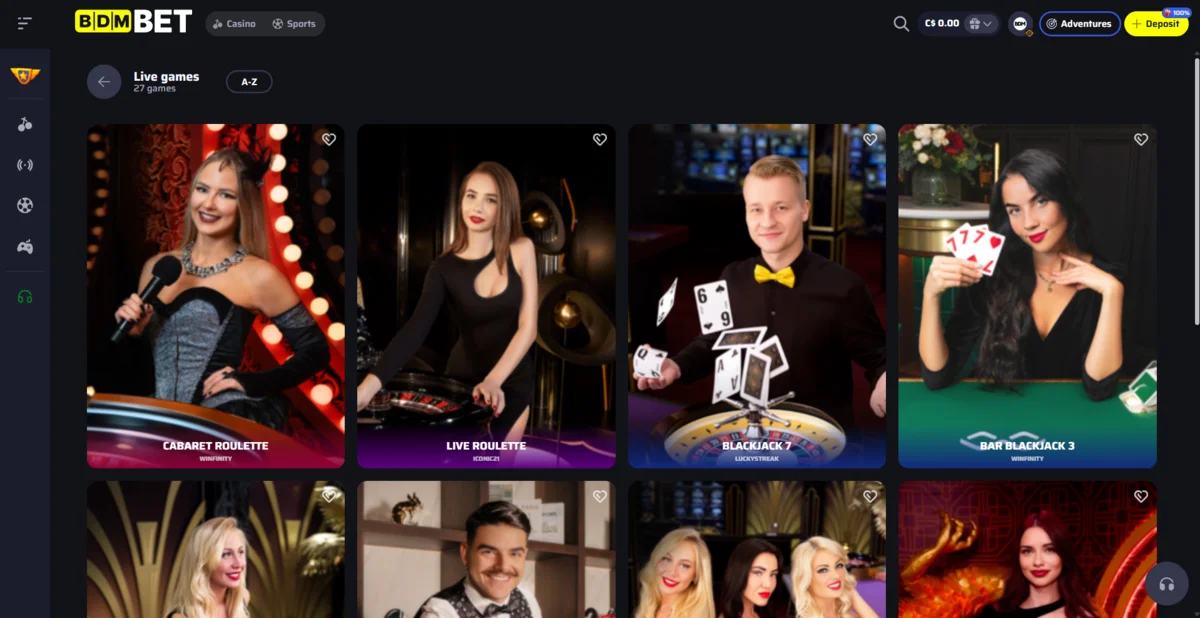 BDMbet has a live lobby with separate sections for blackjack, roulette and game shows. Many of the games in this section are geo-restricted, which means players in Canada can only access Live Roulette European and Live Roulette European VIP.