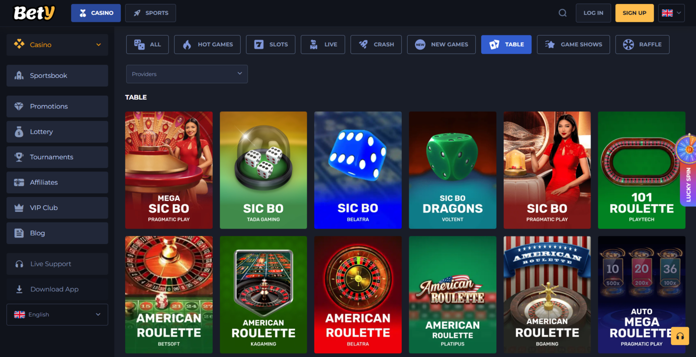Bety Casino has one of the largest game libraries in the industry, with over 10,000 titles from nearly 70 providers. Players can filter games by provider or category.