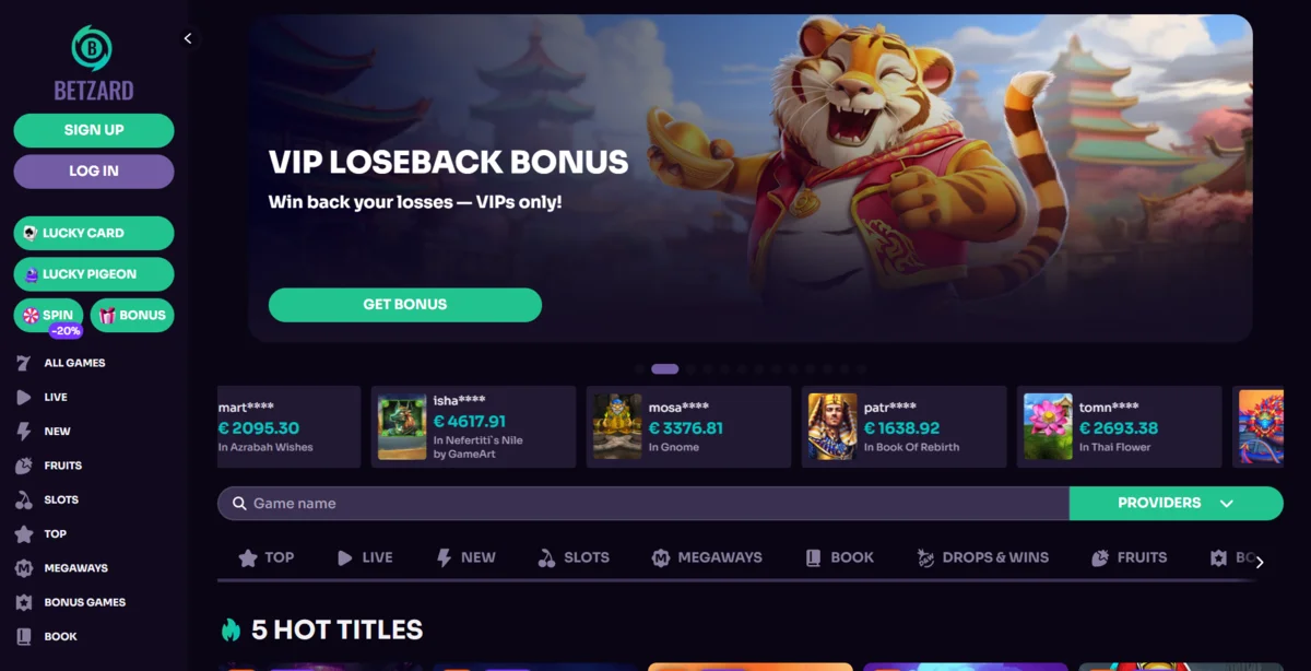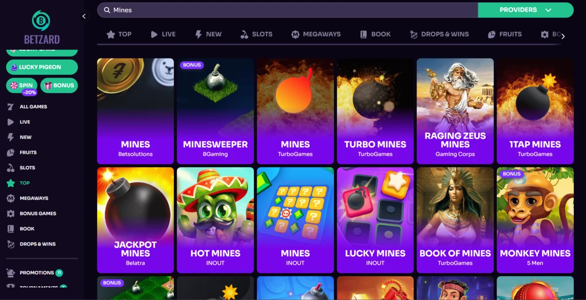 The slot collection at Betzard is extensive and covers all the bases in terms of variety, volatility levels and RTP options. Players have all the options at their disposal from classic slots to more advanced games. We found it simple to find our favorite games whether that be by reviewing the provider pages or using the search bar.