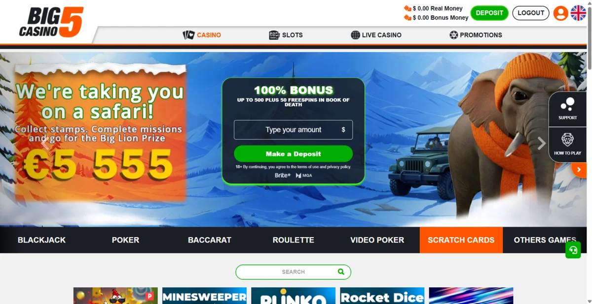 Big5Casino is a crypto-friendly online casino with a unique safari-themed vibe, featuring cartoon lions, rhinos, and elephants that give the site a playful atmosphere.