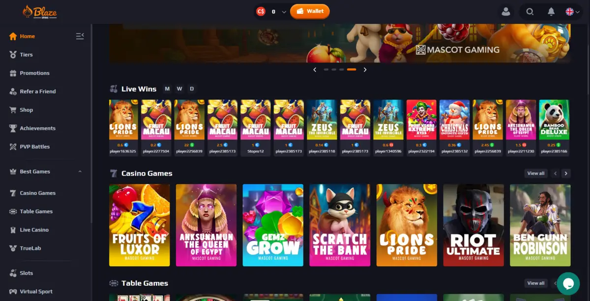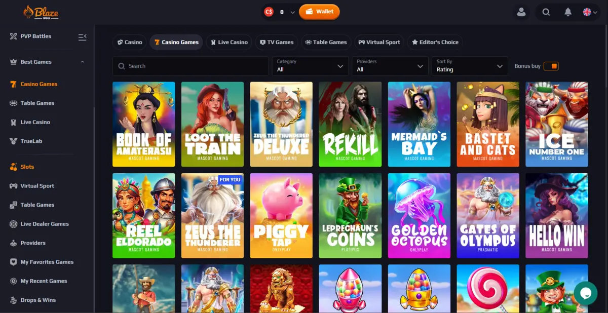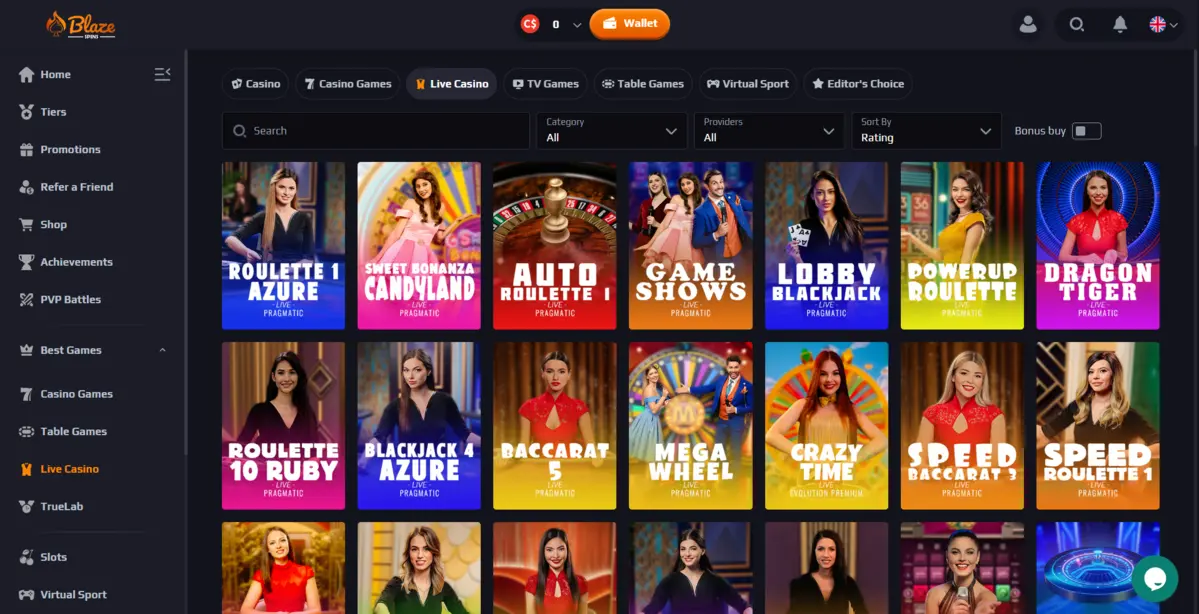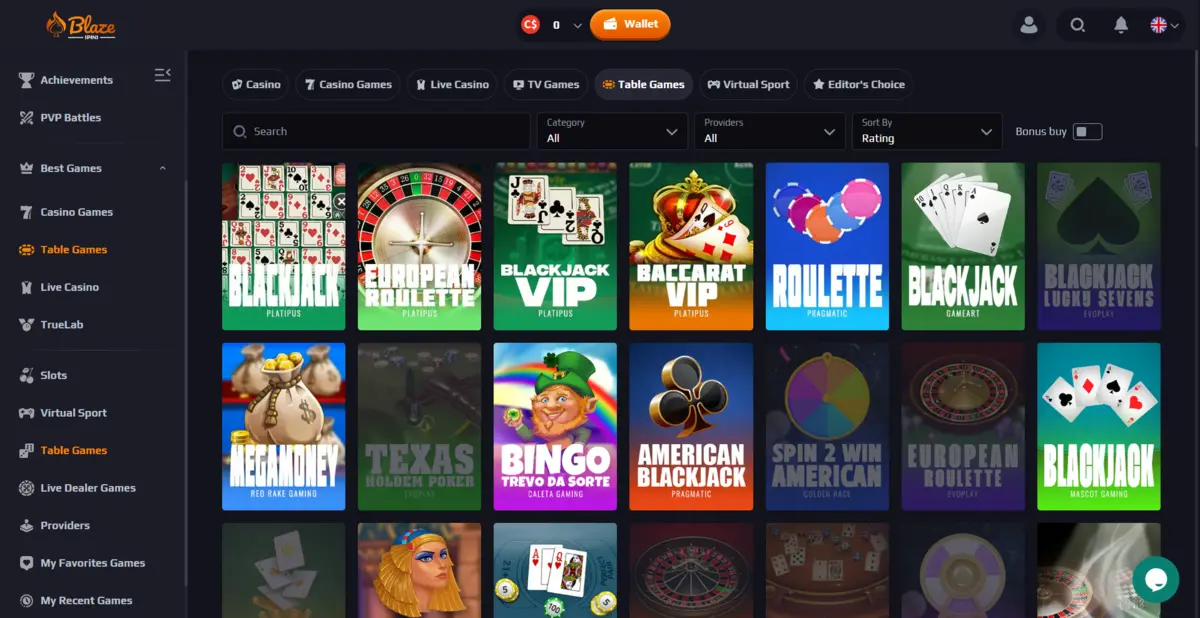 Blaze Spins has a really strong collection of table games, both virtual and live, from trusted providers like Pragmatic Play, Evolution, Platipus, and GameArt.
