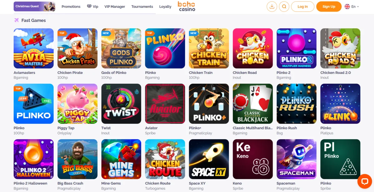When it comes to instant-win games, which are very popular with crypto players, Boho Casino has a lot of them. Not only that, but they offer Crash games such as Aviator as well as a solid selection of variants on the top instant-win games of Mines and Plinko.