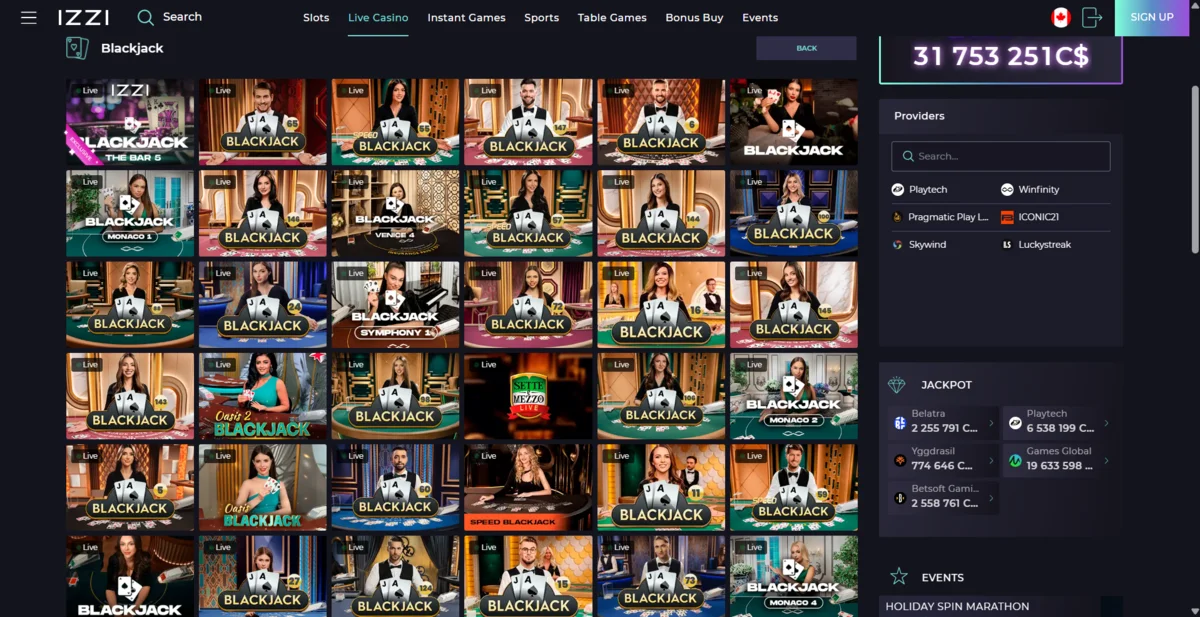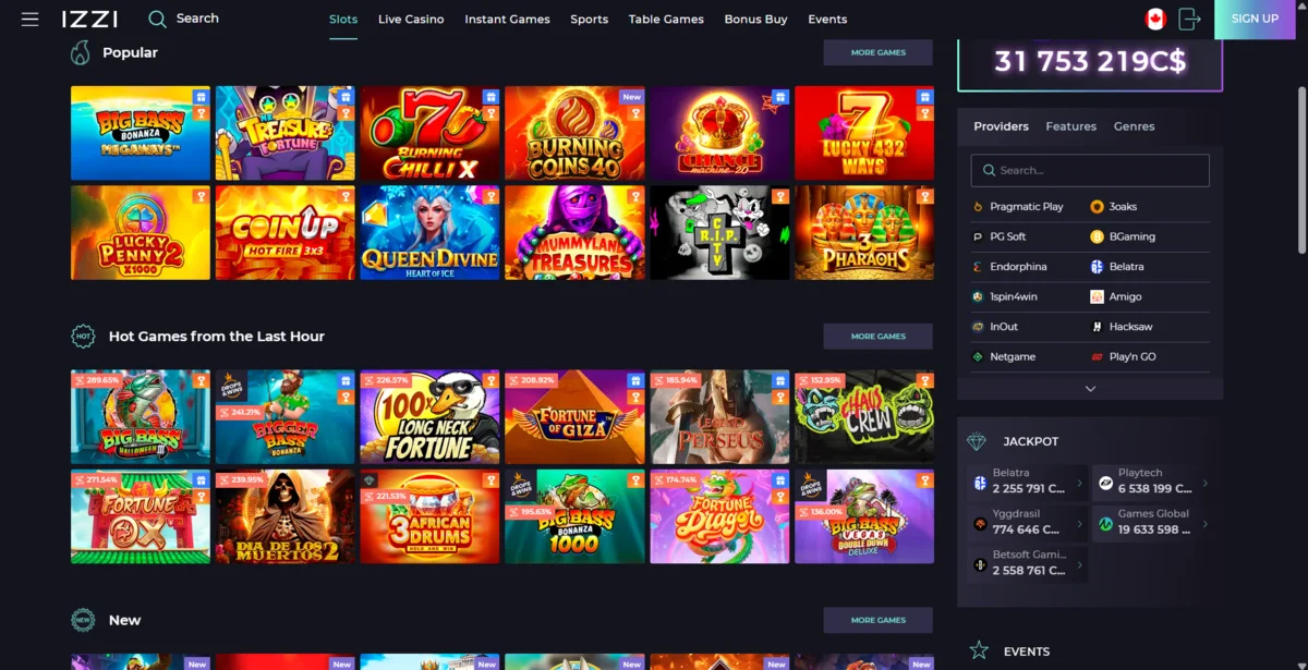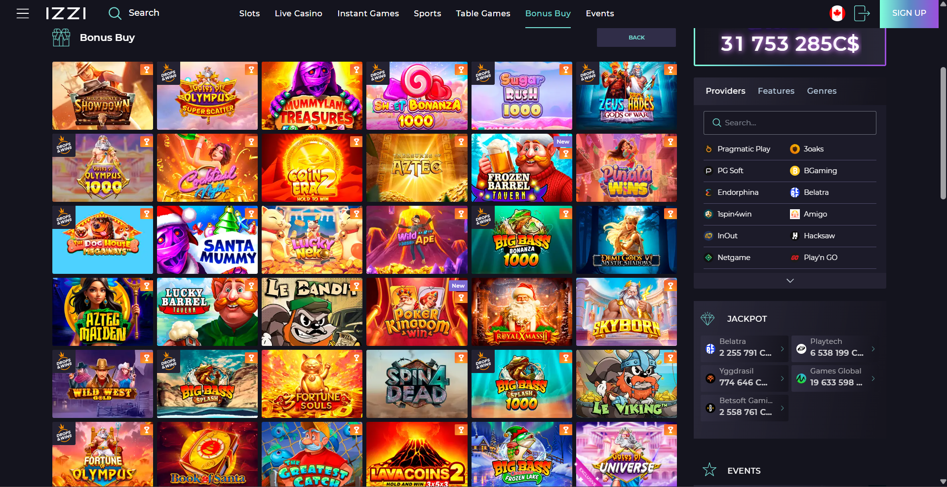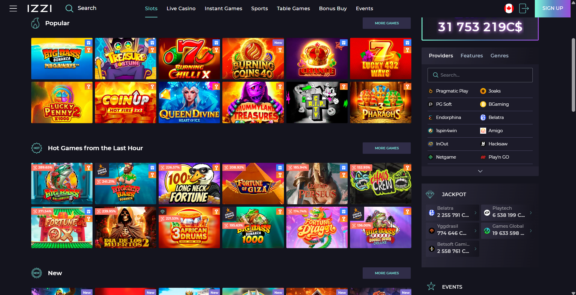 Izzi has one of the better filtering systems when it comes to its games and you can see many of them by simply scrolling down the page. However, on the right hand side of the page there are the tab filters of Providers, Features, and Genres. This is pretty unique, especially for the Features, where there are additional filters such as Multipliers, Re-Spins, Megaways, and Hold & Win. There are also 27 tabs for the various genres from Sports and Horror to Pirates and Sci-Fi.