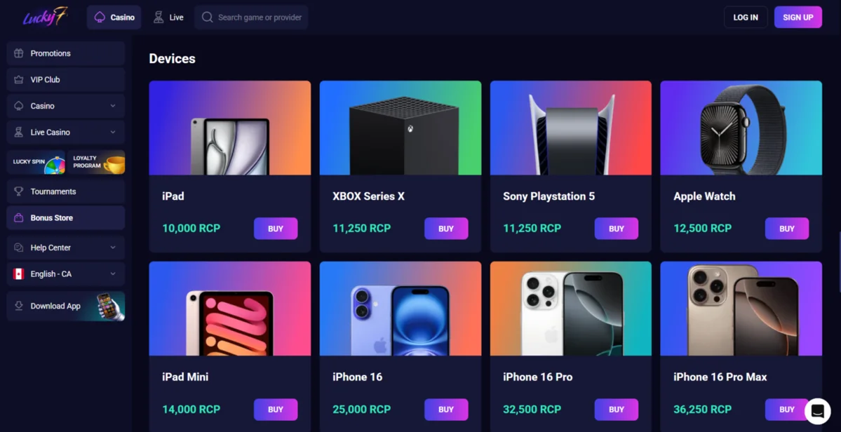 Lucky7Even has the unique Bonus Store where you can use redeemable comp points (RCP) to get free spins, cash rewards, subscriptions, and devices. You receive one RCP or one point (CP) for every €20 that you wager, and you use RCP at the Bonus Store and the CP for leveling up in the Loyalty Program.