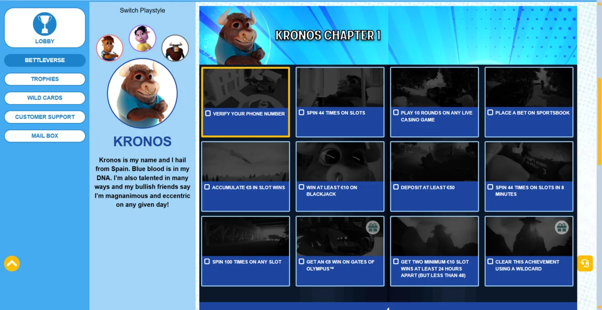 However, they do offer a customer promotion called Bettleverse. It allows players to complete tasks ranging in difficulty from relatively easy (e.g. verify your phone number) to relatively more challenging (e.g. get two $10 slot wins at least 24 hours apart (but less than 48) in exchange for rewards.
