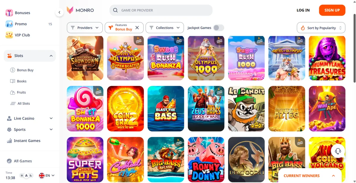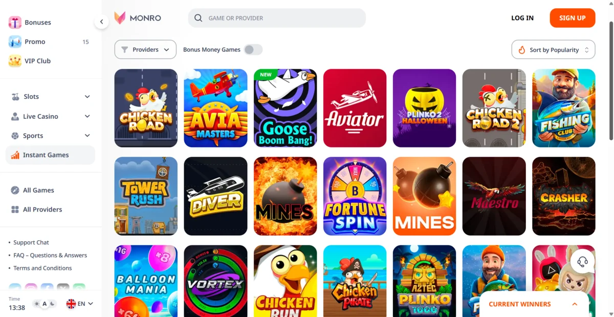 Instant games such as Crash, Mines, and other crypto-friendly titles are also well-represented. The one drawback is the lack of virtual table games. Players looking for digital blackjack or roulette won’t find those here, as Monro focuses on live dealer formats.
