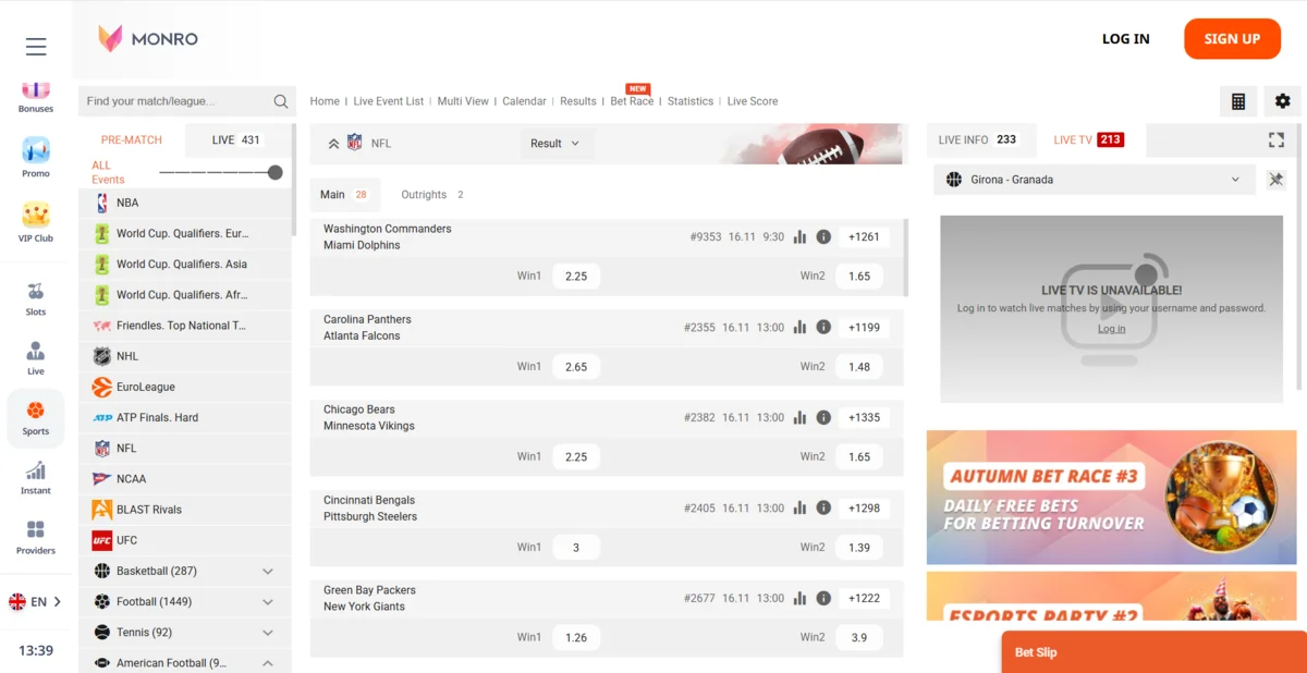 Yes, Monro Casino has a sportsbook, although we found it to be rather difficult to navigate.