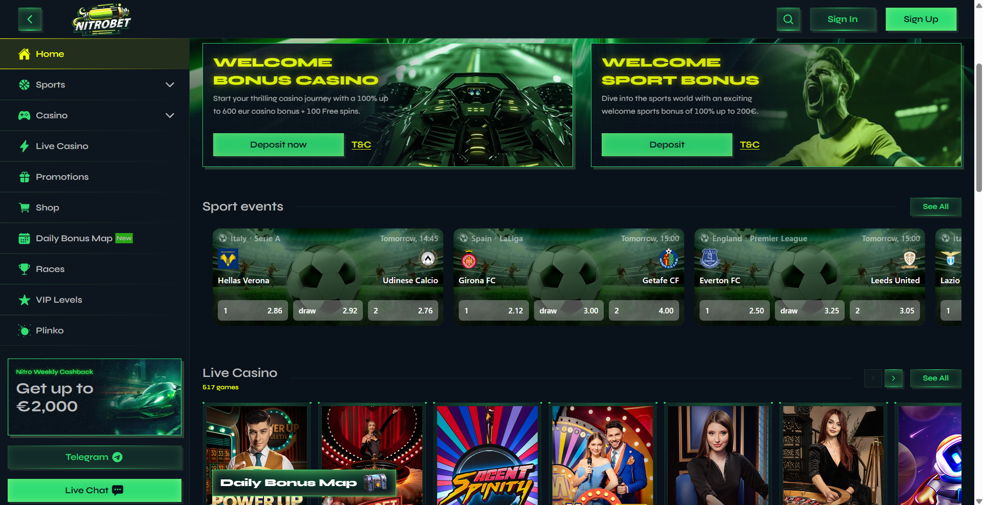 - Nitro Weekly Cashback: 20% cashback up to €2,000 weekly · VIP tier dependent