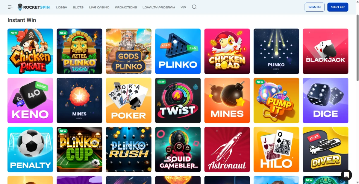 There are over 3,000 games at RocketSpin Casino, offering a diverse selection that includes slots, table games, live dealer games, and instant win games. You can play most games for free in demo mode, and regardless of your bankroll, you can enjoy the titles, which can be played at a wide variety of stakes. On the main page, you will see the tabs of: