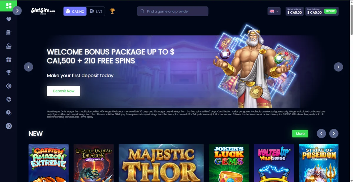 SlotSite offers a four-part welcome package totaling up to $ CA1,500 + 210 Free Spins, available to new Canadian players.