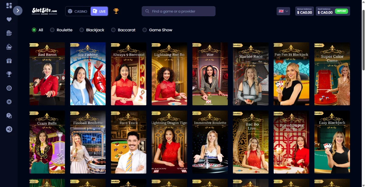 The live casino is a standout feature. Powered primarily by Evolution, it includes: