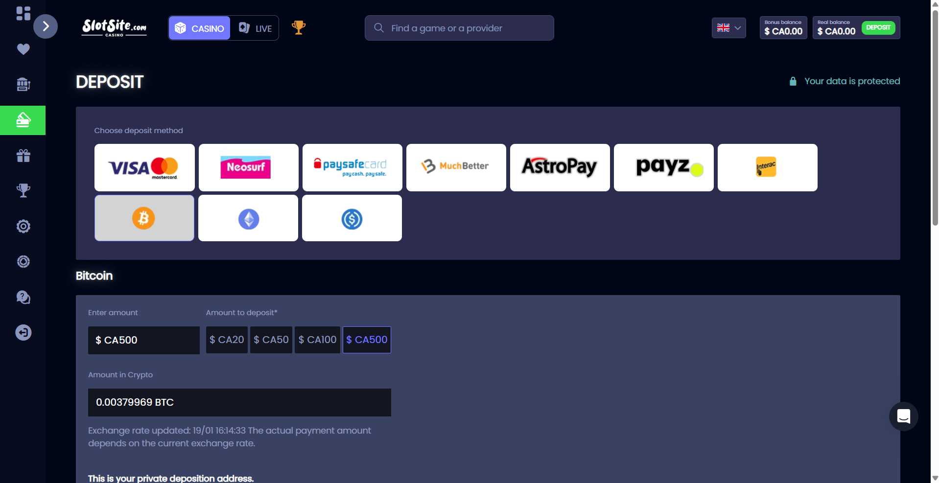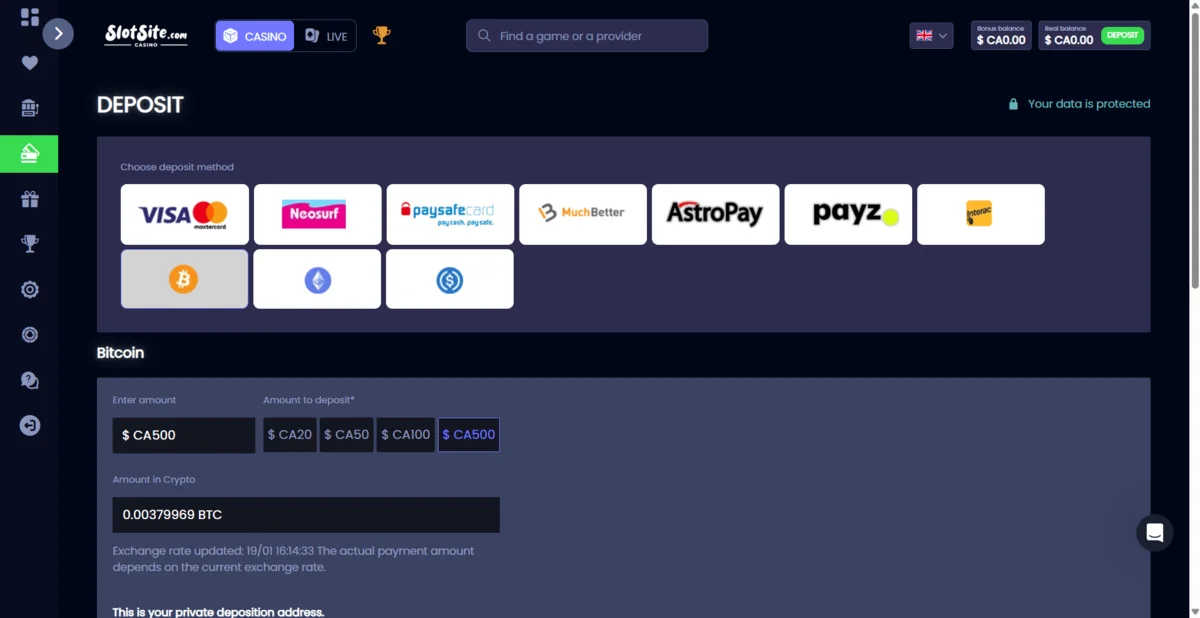 SlotSite supports both cryptocurrency and Canadian-friendly fiat methods.