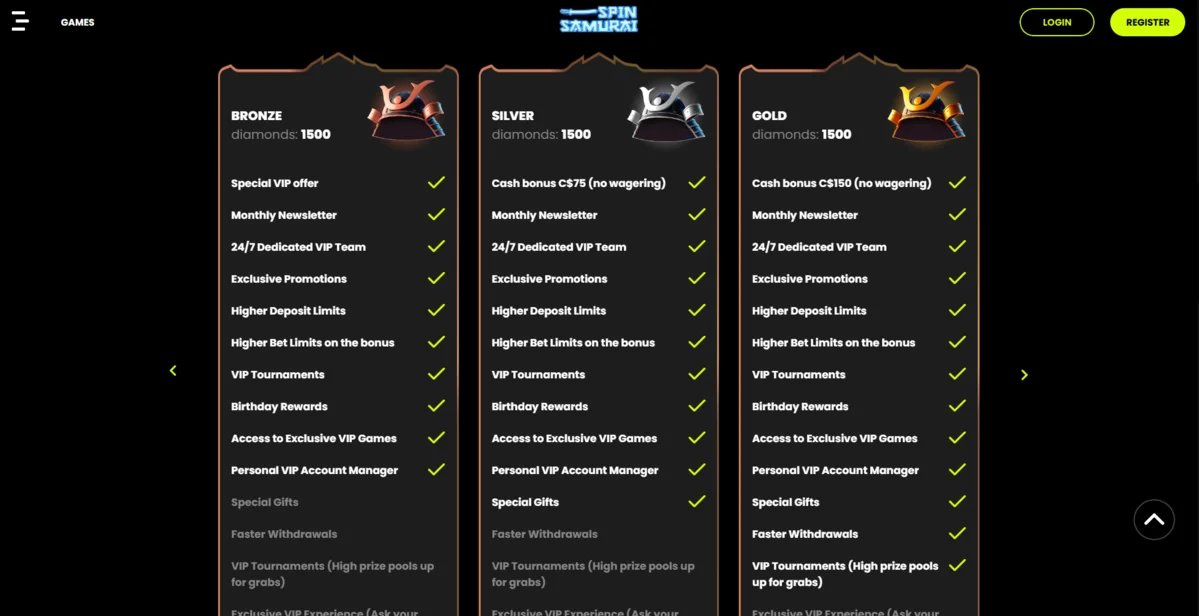 Spin Samurai offers two programs in the Loyalty Program and VIP. The Loyalty Program is available to every player where you receive one come point (CP) for every €20 (or crypto equivalent) that you wager. This program is unique as you can choose the benefits in two of the options.