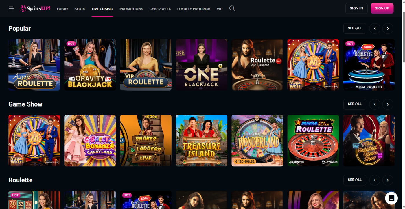 SpinsUp Casino’s live dealer games are well laid out with sections for roulette, blackjack, baccarat and other games. We found different variants of live baccarat, blackjack, roulette, poker and game shows. They even have specialised options for high rollers including VIP blackjack, VIP Baccarat NC and Portomaso VIP.