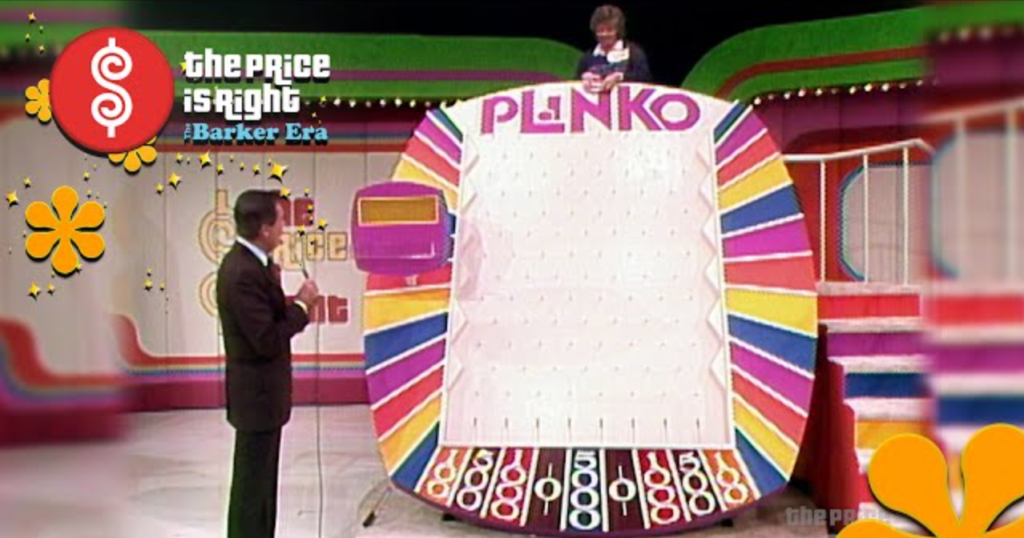 The American version we know as Plinko premiered on The Price Is Right in 1983. Created by Frank Wayne, the game quickly became a highlight of the show. Players dropped discs from the top of a pegged board, listening to the satisfying “plink-plink” as they bounced toward prize slots. Contestants could win up to $25,000, with the top prize originally centred and “no prize” slots flanking it.