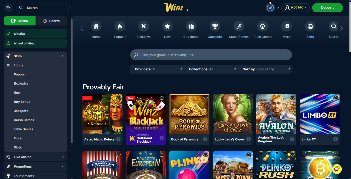 A Winz.io dispõe de uma coleção massiva de slots, incluindo: Sugar Rush 1000, Sweet Bonanza, Gates of Olympus 1000, Le Bandit, Big Bass Bonanza, Stack ’Em, Wanted Dead or a Wild, R.I.P. City e Area 69.