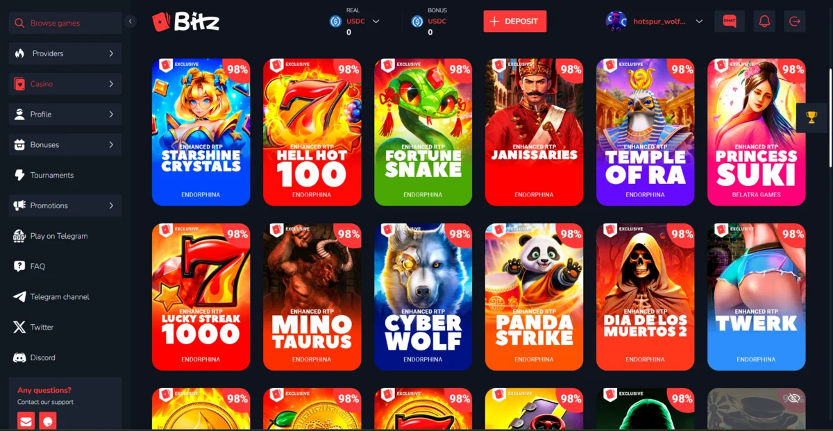 Yes, Bitz has a unique collection of 98% RTP slots powered by Endorphina.