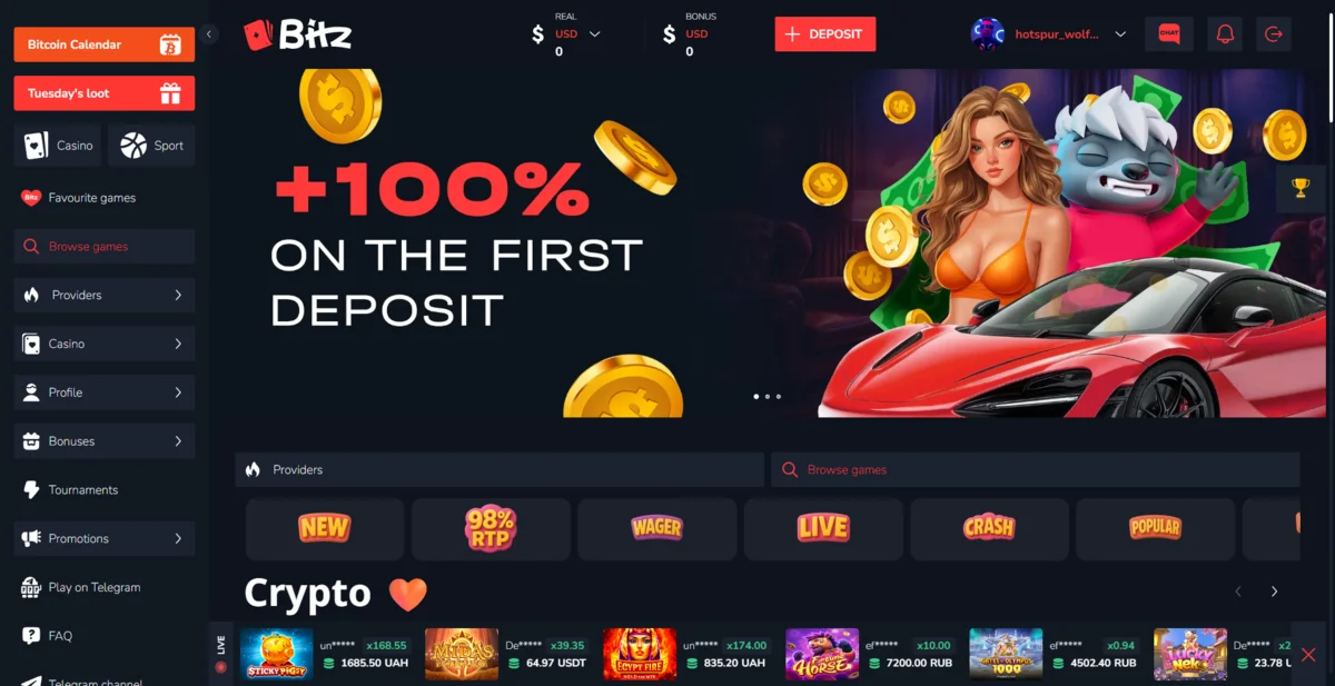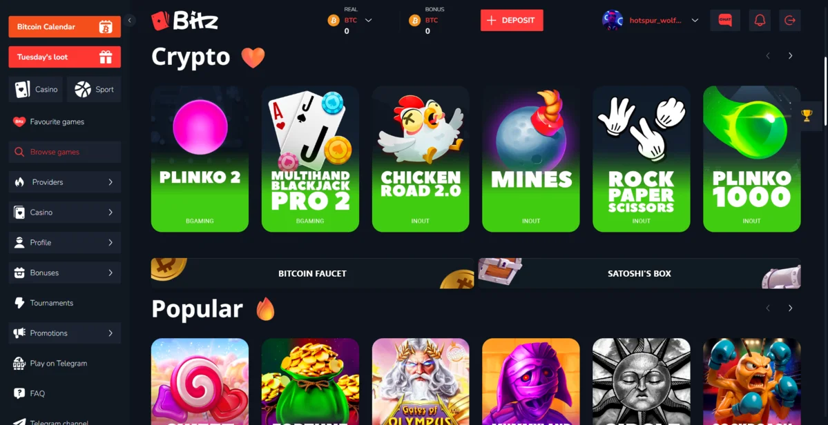 Bitz.io delivers strong variety across slots, provably fair games, table games, and live casino.