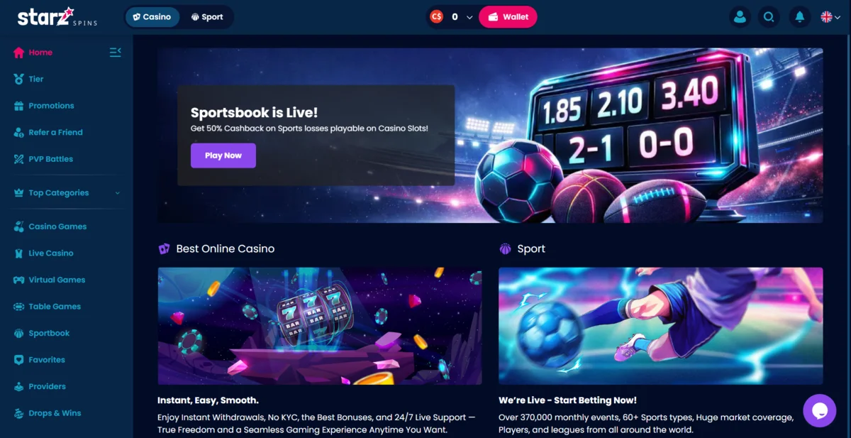 Starz Spins is a newly launched crypto casino (est. 2025) operated by One Touch Exch Co. Ltd and licensed in Anjouan, Comoros. Despite being a fresh entrant, it already offers a massive slot library (12,000+ games), a solid sportsbook, and fast crypto payments with no KYC required for standard transactions.