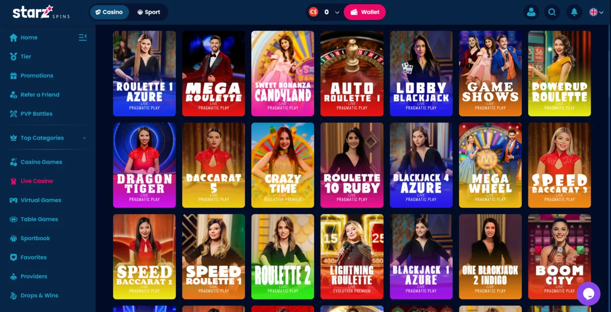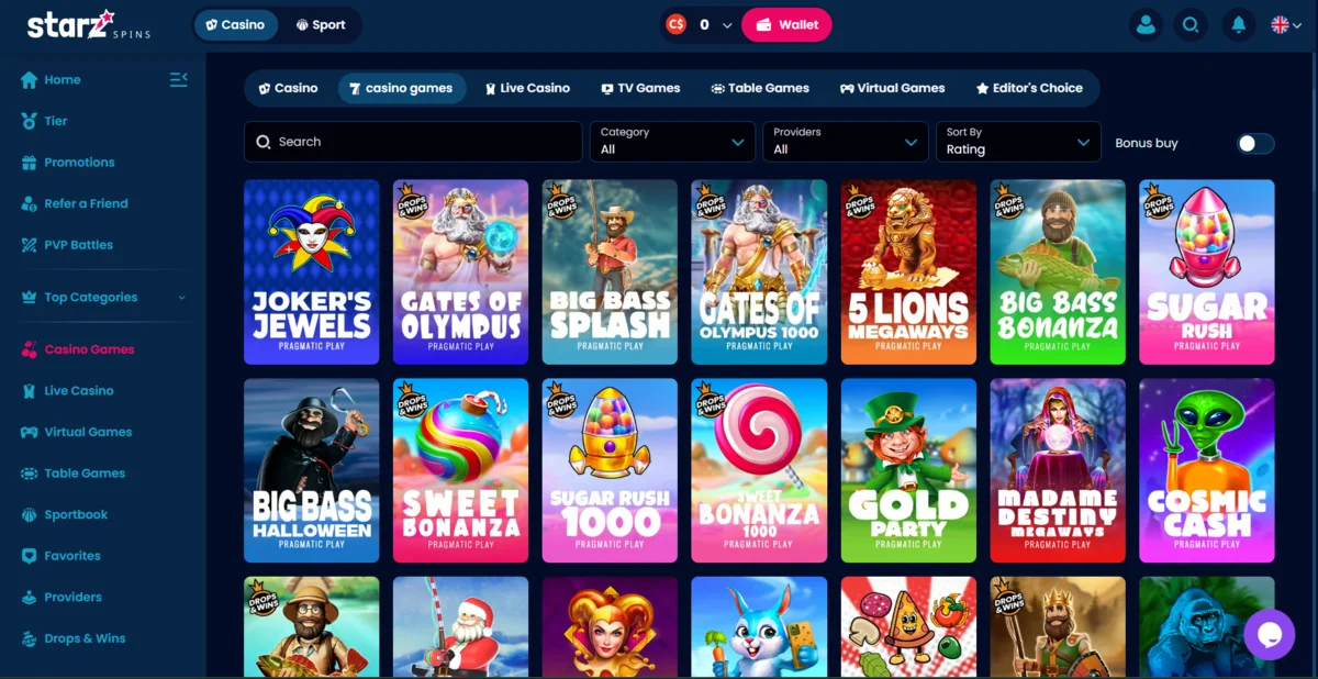 Starz Spins boasts 12,000+ slot games, which puts it among the larger crypto casino libraries.