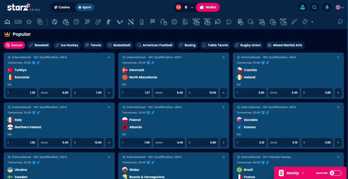 Starz Spins includes a fully functional sportsbook with a familiar crypto betting interface.